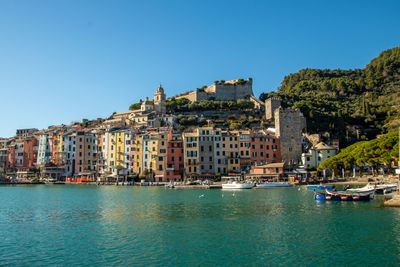 Porto Venere es un municipio encaramado sobre una península rocosa en la costa de Liguria, rodeado de acantilados escarpados y el golfo de La Spezia. Hileras de casas coloridas bordean el paseo marítimo, mientras la iglesia de San Pietro se alza sobre el promontorio frente al mar.