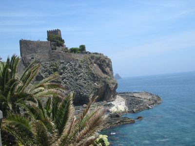 El municipio de Aci Castello se extiende por la costa oriental siciliana, con playas de arena negra y formaciones rocosas volcánicas a 15 metros sobre el mar.