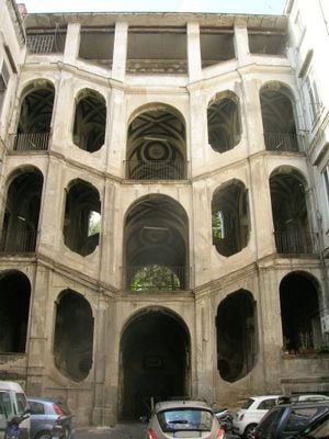 La fachada indistinta del edificio oculta una estructura interna elaborada que influyó en diseños arquitectónicos posteriores en Nápoles.