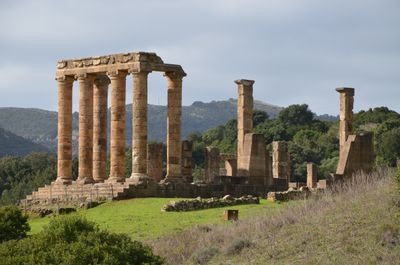 El Templo de Antas presenta columnas monumentales y un altar en un valle rodeado por colinas calcáreas de la región de Cerdeña.