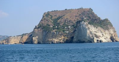 El Cabo Miseno se extiende hacia el mar Tirreno, señalando el límite noroeste del Golfo de Nápoles y la Bahía de Pozzuoli en Campania.