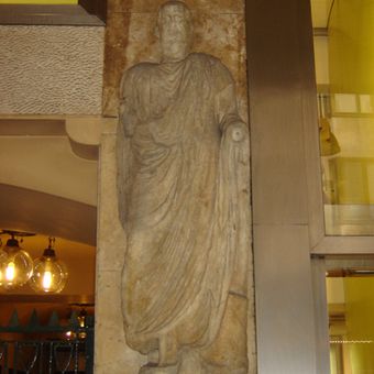 El relieve de mármol muestra una figura masculina con toga, sin brazos y con la pierna derecha adelantada en posición clásica.