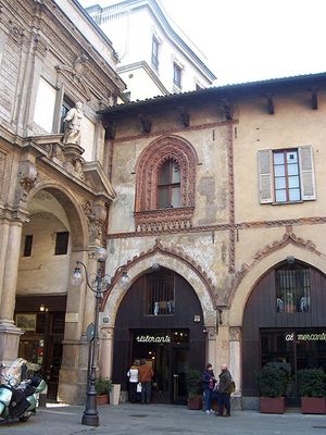 La sección izquierda de Casa Panigarola alberga un restaurante, mientras la derecha contiene una logia con acceso al Palazzo della Ragione.