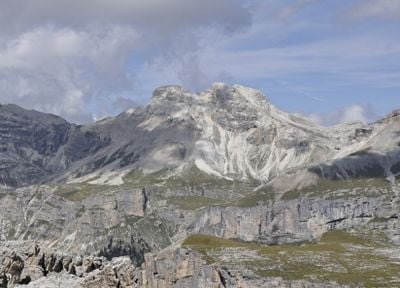 El Pizes de Puez alcanza una altura de 2.918 metros, con acantilados de piedra caliza y formaciones rocosas características dentro del Parque Natural Puez-Odle.