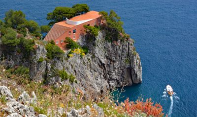 Casa Malaparte es una residencia moderna construida con mampostería roja en un promontorio de Capri, encaramada en un acantilado sobre el mar. La estructura cuenta con escaleras piramidales invertidas inusuales que conducen a una gran terraza en la azotea y se puede llegar desde el mar o subiendo desde el pueblo.