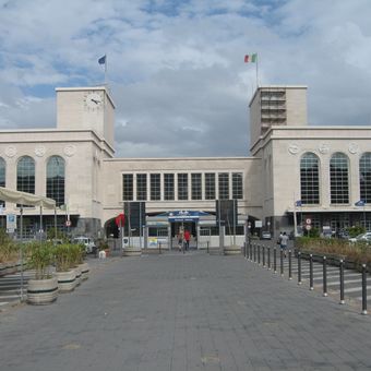 La estación exhibe doce medallones de piedra de Trani que representan ciudades internacionales como Roma, Atenas, El Cairo, Río de Janeiro y Calcuta.
