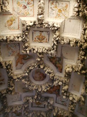 El techo muestra intrincadas pinturas grotescas enmarcadas por piedras porosas, creando una mezcla sorprendente de elementos naturales y artísticos. Cuatro estatuas de cabras de mármol colocadas en el interior representan una referencia dual tanto a Cosimo I de Medici como a la figura mitológica Amalthea.