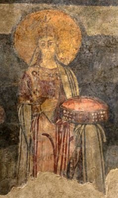 La Cripta de Epifanio contiene frescos medievales detallados que representan santos con vestimentas bizantinas en sus paredes y techo abovedado.