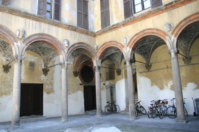 Los capiteles de piedra caliza incorporan el escudo de armas de la familia Grifi con un grifo rampante y medallones con retratos de emperadores.