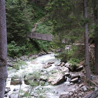El Gilfenklamm se extiende 2.5 kilómetros a través de paredes de mármol blanco, con puentes y pasarelas que cruzan el arroyo de montaña Rio Racines.