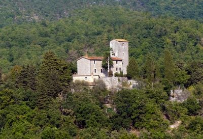 El castillo de piedra se eleva entre las colinas de la Toscana, con elementos arquitectónicos tradicionales que incluyen gruesos muros defensivos y tejas de terracota.