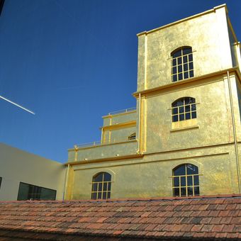 Las instalaciones incluyen una torre reflectante cubierta de pan de oro que se eleva sobre el complejo, representando una adición arquitectónica moderna.