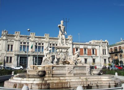La fuente representa a Neptuno controlando los monstruos mitológicos del Estrecho, reflejando la profunda conexión entre Messina y las tradiciones marítimas.