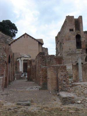 El complejo presenta una escalera cubierta que conduce al Palatino y contiene los restos de la iglesia Santa Maria Antiqua del siglo VI.