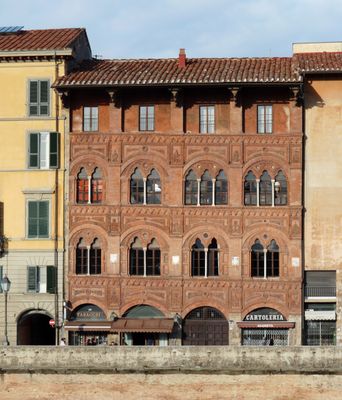 Palazzo Agostini es un palacio en la orilla norte del Arno en Pisa, mostrando características renacentistas con ladrillo rojo y ventanas de arco apuntado enmarcadas en terracota. El edificio de tres pisos se extiende a lo largo de Lungarno Pacinotti y conserva su fachada original con comodidades modernas como un ascensor.