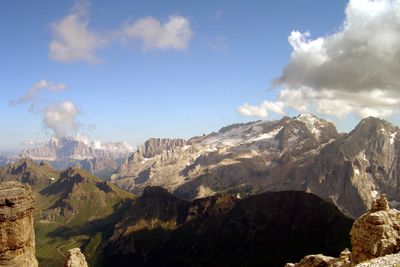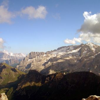 La Marmolada alcanza una altura de 3.343 metros, con un glaciar destacado en su cara norte y acantilados pronunciados que se extienden varios kilómetros.