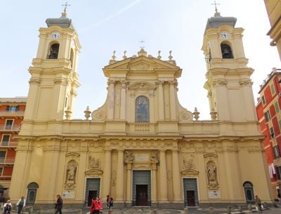 La Nostra Signora della Rosa presenta una fachada barroca con columnas gemelas y estatuas de los apóstoles Pedro y Pablo cerca de Piazza Caprera.
