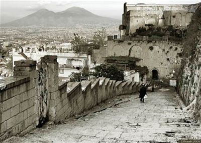 La escalinata Pedamentina, con sus 414 escalones desde el Monasterio de San Martino hasta el centro histórico, representa la conexión urbana tradicional napolitana.