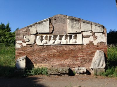 La tumba exhibe arquitectura sepulcral romana característica con una fachada decorada e inscripciones ubicada en el cuarto miliario de Via Appia Antica.