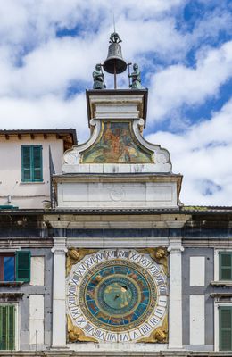 La Torre dell'Orologio presenta dos autómatas de cobre en su parte superior que golpean una campana de bronce para marcar las horas.