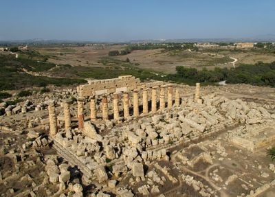 El templo C se alza en la colina oriental de la acrópolis de Selinunte y es uno de los templos más antiguos del lugar. La estructura muestra 14 columnas que fueron reconstruidas en los años 1920, con restos de bloques de piedra y cimientos del siglo VI aún visibles en sus posiciones originales.
