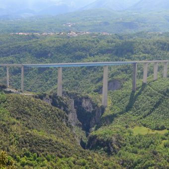 El Viaducto Italia atraviesa la garganta del río Lao con 19 tramos y mide 1.161 metros de longitud y 260 metros de altura.