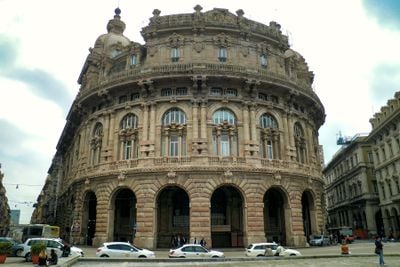 La Bolsa de Génova es un edificio neoclásico con fachada curva y grandes columnas arqueadas, ubicado en una plaza principal en el centro de la ciudad. Hoy alberga diferentes oficinas y espacios comerciales.
