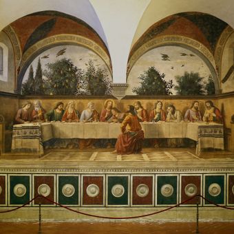 El Cenacolo di Ognissanti es un museo de arte en Florencia que alberga un monumental fresco mural de la Última Cena. La composición muestra a Cristo con sus discípulos reunidos alrededor de una mesa de comedor, rodeados de comida, vasijas y elementos arquitectónicos que crean una sensación de continuidad con el refectorio mismo.