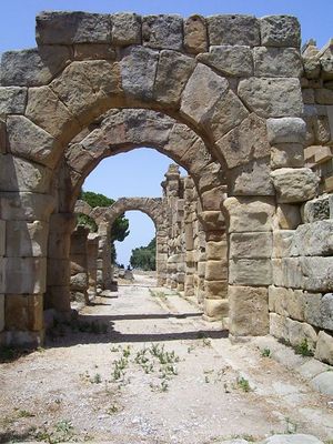 El área arqueológica abarca 27 hectáreas y contiene ruinas greco-romanas que incluyen un teatro, termas y estructuras residenciales con patios peristilos.