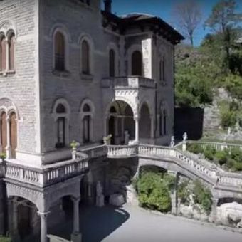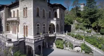 Villa Magni-Rizzoli se erige como estructura de piedra con múltiples balcones y terrazas, incorporando materiales de las regiones de Canzo y Vicenza.