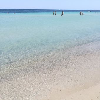La playa presenta una combinación de arena dorada y zonas rocosas a lo largo de la costa mediterránea, formando diversos entornos.