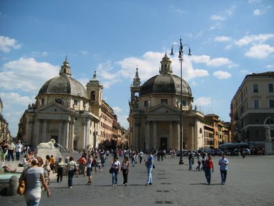 Santa Maria dei Miracoli y Santa Maria in Montesanto forman un par simétrico en la Piazza del Popolo, enmarcando la entrada a la Via del Corso con diseño arquitectónico gemelo. Una posee una planta circular bajo su cúpula, mientras que la otra tiene un trazado elíptico que difiere de su compañera a pesar de su apariencia exterior parecida.