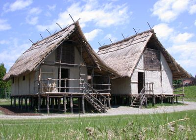 Dos casas a escala real demuestran los métodos de construcción de la Edad del Bronce, incorporando fosos protectores y cimientos de madera característicos del norte italiano.