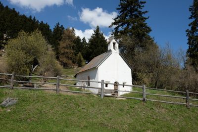 Una cruz de madera junto a la capilla lleva inscripciones en alemán e italiano. Este carácter bilingüe refleja el patrimonio cultural de Tirol del Sur y una región donde coexisten dos idiomas y tradiciones.
