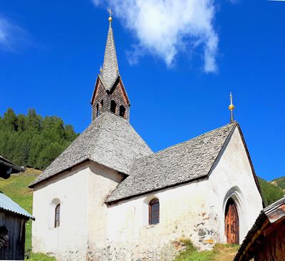 El campanario alberga una campana de 1470, convirtiéndola en una de las campanas funcionales más antiguas del Valle de Vinschgau.