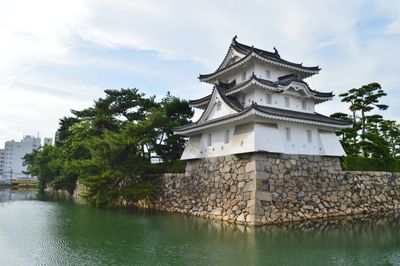 El castillo mantiene fosos activos de agua marina donde nadan doradas, siendo uno de los tres grandes castillos de agua junto con Imabari y Nakatsu.