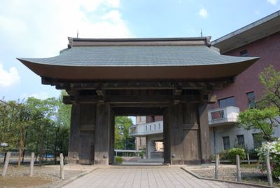 El recinto del castillo conserva fosos, muros de piedra y la puerta Otemon reconstruida, que destaca como una de las puertas de madera más grandes de Japón.