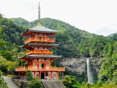El templo comprende múltiples edificios y estructuras cerca de las cascadas Nachi, incluyendo una pagoda de tres pisos y puertas montañosas.