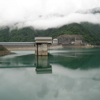 La presa recoge agua de deshielo del monte Hakusan a través de una red de arroyos montañosos que se convierten en torrenteras durante el deshielo primaveral. El agua fluye hacia un embalse que se extiende profundamente en los valles boscosos, creando un contraste entre la estructura y la naturaleza.