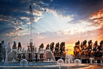 El sistema central de fuentes tiene cinco tazones en cascada con el chorro principal alcanzando 30 metros durante espectáculos musicales nocturnos.