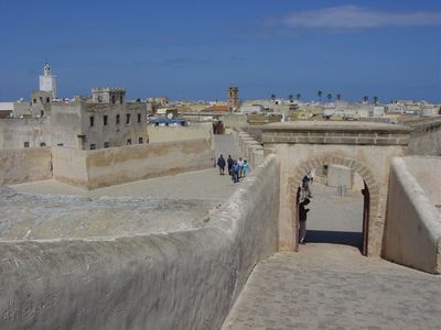 La ciudad costera atlántica presenta murallas del siglo XVI que se extienden junto al océano, rodeando calles estrechas y edificios marroquíes tradicionales.