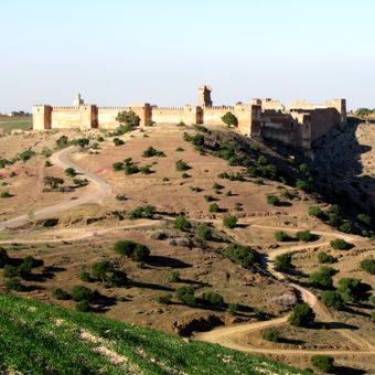 La fortaleza militar se alza sobre una formación rocosa en la curva del río Oum Er-Rbia, dominando las tierras agrícolas circundantes.