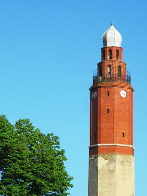 La torre hexagonal combina una base de arenisca con secciones superiores de ladrillo, elevándose cerca del antiguo distrito comercial.