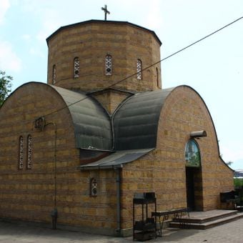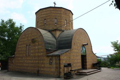 La iglesia presenta muros de piedra revestidos con ladrillos y mortero blanco, mostrando elementos arquitectónicos característicos de edificios ortodoxos orientales.