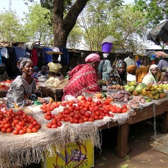 El mercado central de la ciudad de Sikasso opera como centro comercial principal para productos agrícolas, especialmente algodón, frutas y verduras.