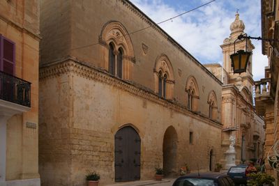 Palazzo Santa Sofia es un palacio en Mdina con orígenes en el siglo XIII que presenta dos puertas principales en la planta baja flanqueando la entrada original del pasaje y una característica cornisa de patrón de diamantes de dos niveles. La fachada exhibe escudos de armas en varios niveles, reflejando la importancia histórica del edificio en el patrimonio arquitectónico de Malta.