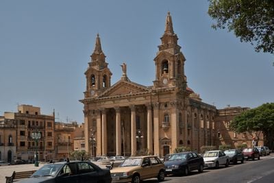 La Iglesia Parroquial de San Publio es una iglesia parroquial de estilo neoclásico en Floriana con una fachada distintiva y elementos arquitectónicos característicos. El exterior muestra columnas, dos torres de campanas gemelas y una cúpula central sobre la planta cruciforme, mientras que el interior se organiza mediante bóvedas y altares que sustentan las funciones religiosas.