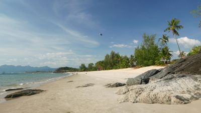 La playa de Cenang se extiende por dos kilómetros con arena blanca bordeada por palmeras y ofrece vistas despejadas de las islas cercanas.