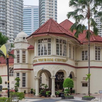El Centro de Turismo de Malasia funciona en un edificio de estilo colonial con paredes blancas, grandes ventanales y elementos arquitectónicos tradicionales de 1930.