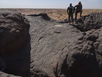 Creados entre 7,000 y 8,000 años atrás, estos petroglifos documentan un período cuando la región del Sahara contenía praderas habitadas por numerosas especies.